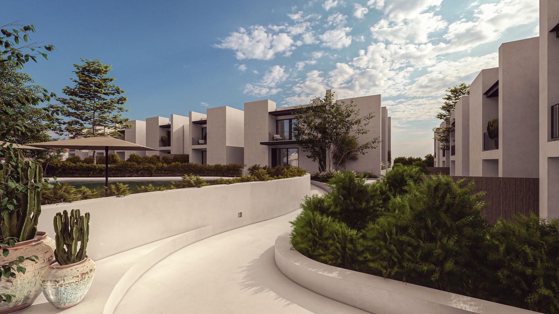 O verde é uma constante em todo o empreendimento, integrando-se harmoniosamente na paisagem. Os espaços exteriores são organizados em torno de percursos envoltos em vegetação, proporcionando privacidade aos residentes e vistas deslumbrantes do interior.