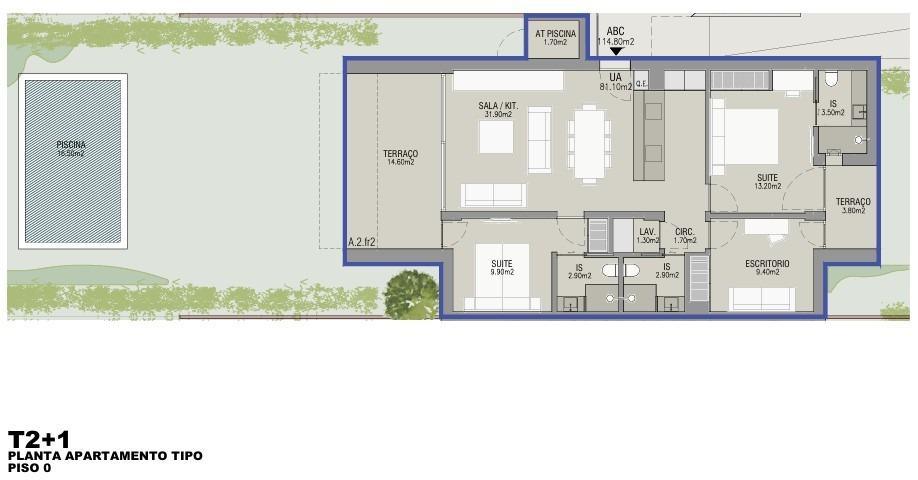 Este apartamento no R/C com 114,8m2 de Área Bruta de Construção, sendo 96,4m2 de área interior e 18,4m2 de terraço, tem ainda um jardim com 199,5m2 com uma piscina privada.